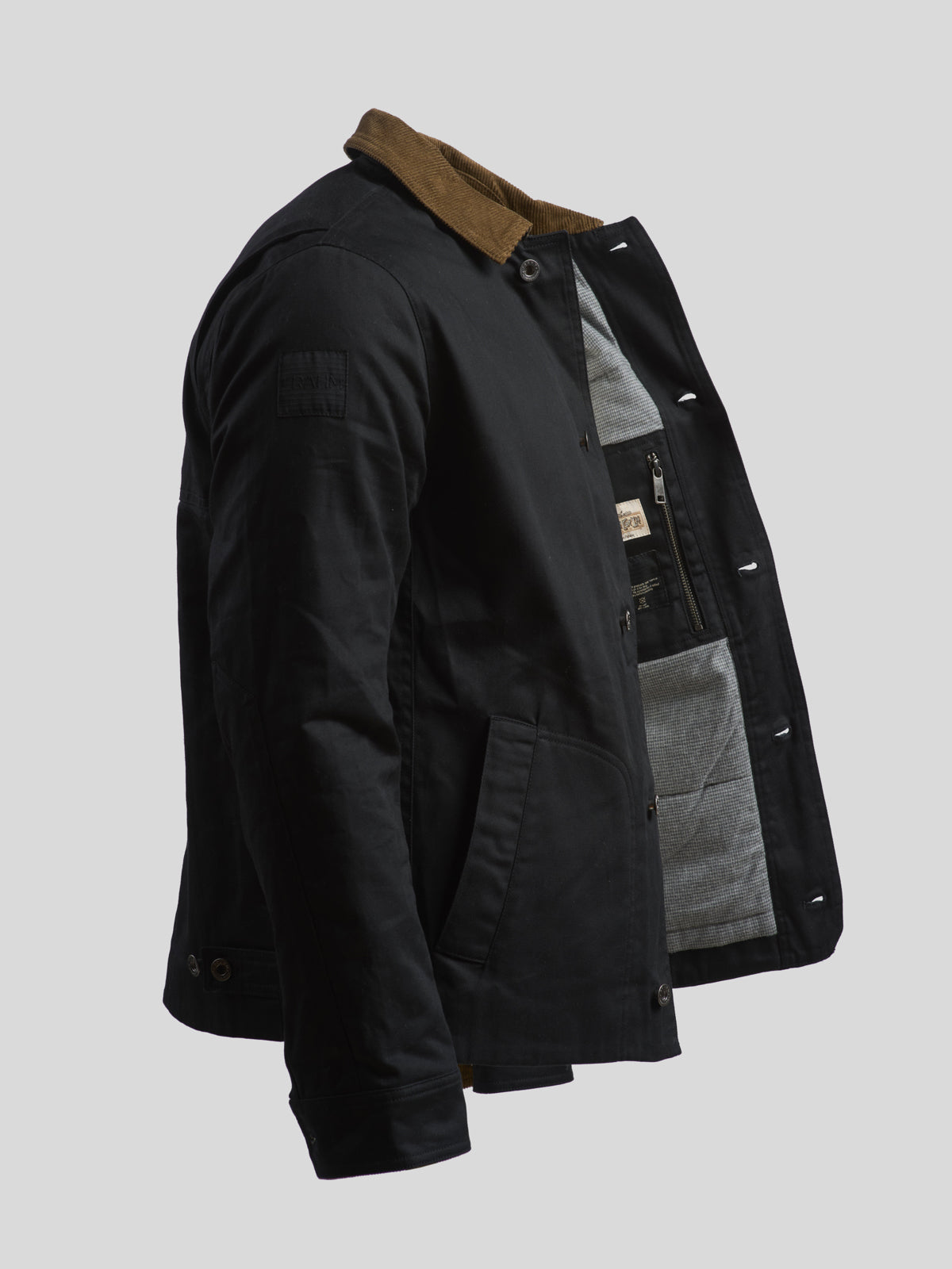 Upgraded US Navy N1 deck jacket. Extremely tough, insulated waxed men's workwear classic, with corduroy collar and quilted lining for cool weather.