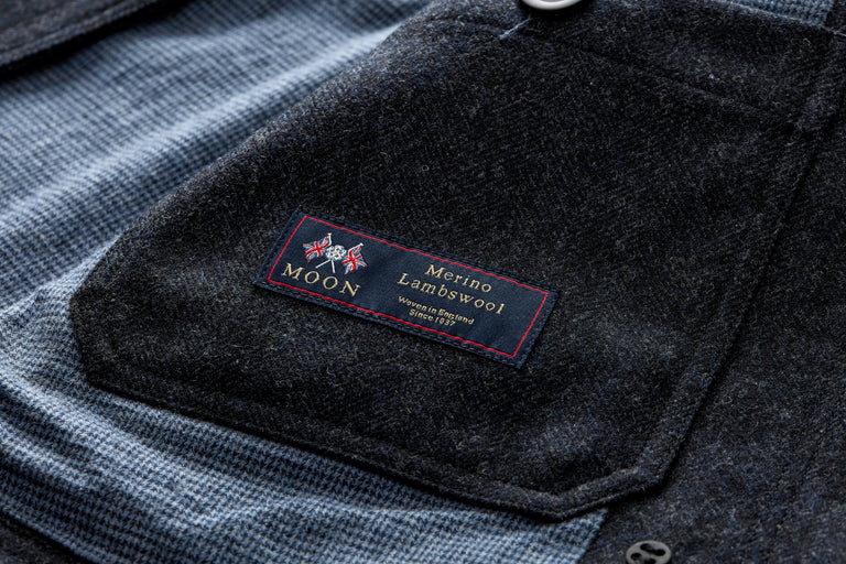 Always smart, easy care, upgraded lumber jacket, in pure merino wool from Abraham Moon of Yorkshire, made smarter & tougher than the days of red check plaid.