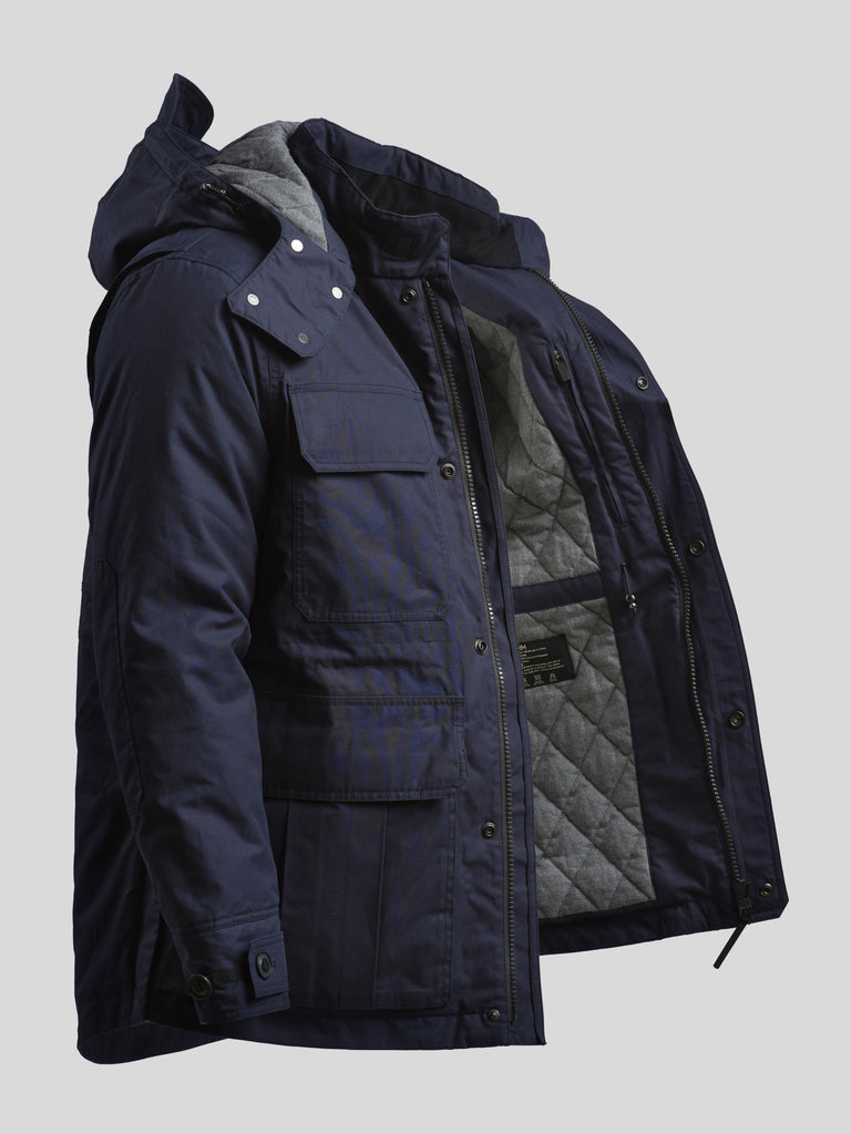 Smart, extremely detailed, quietly luxurious insulated winter coat, with removable hood and rainproof cotton Ventile, developed on Churchill's personal instruction for WWII pilots.