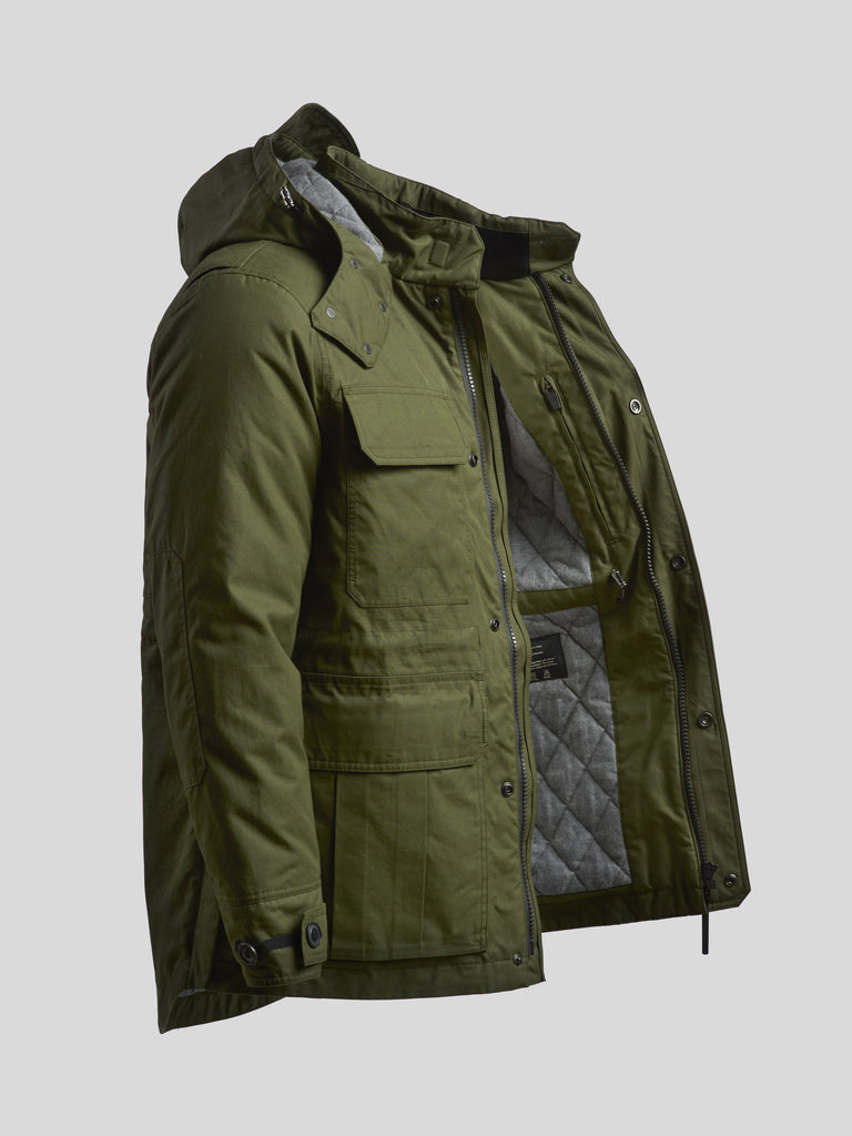 Smart, extremely detailed, quietly luxurious insulated winter coat, with removable hood and rainproof cotton Ventile, developed on Churchill's personal instruction for WWII pilots.