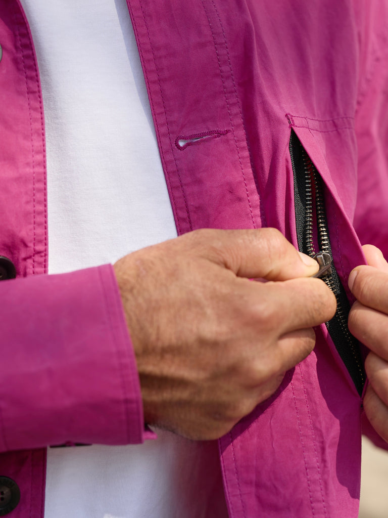Tough, casual, lightweight upgrade of the classic chore jacket, with subtle details. Built with Halley Stevensons dry waxed cotton, for travel or the office.