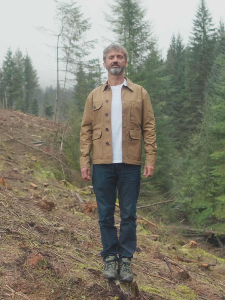 British Millerain of Rochdale's heavyweight dry-waxed cotton really can be dragged through sharp stuff. That means a jacket actually built for woodland, where jagged things stick out.